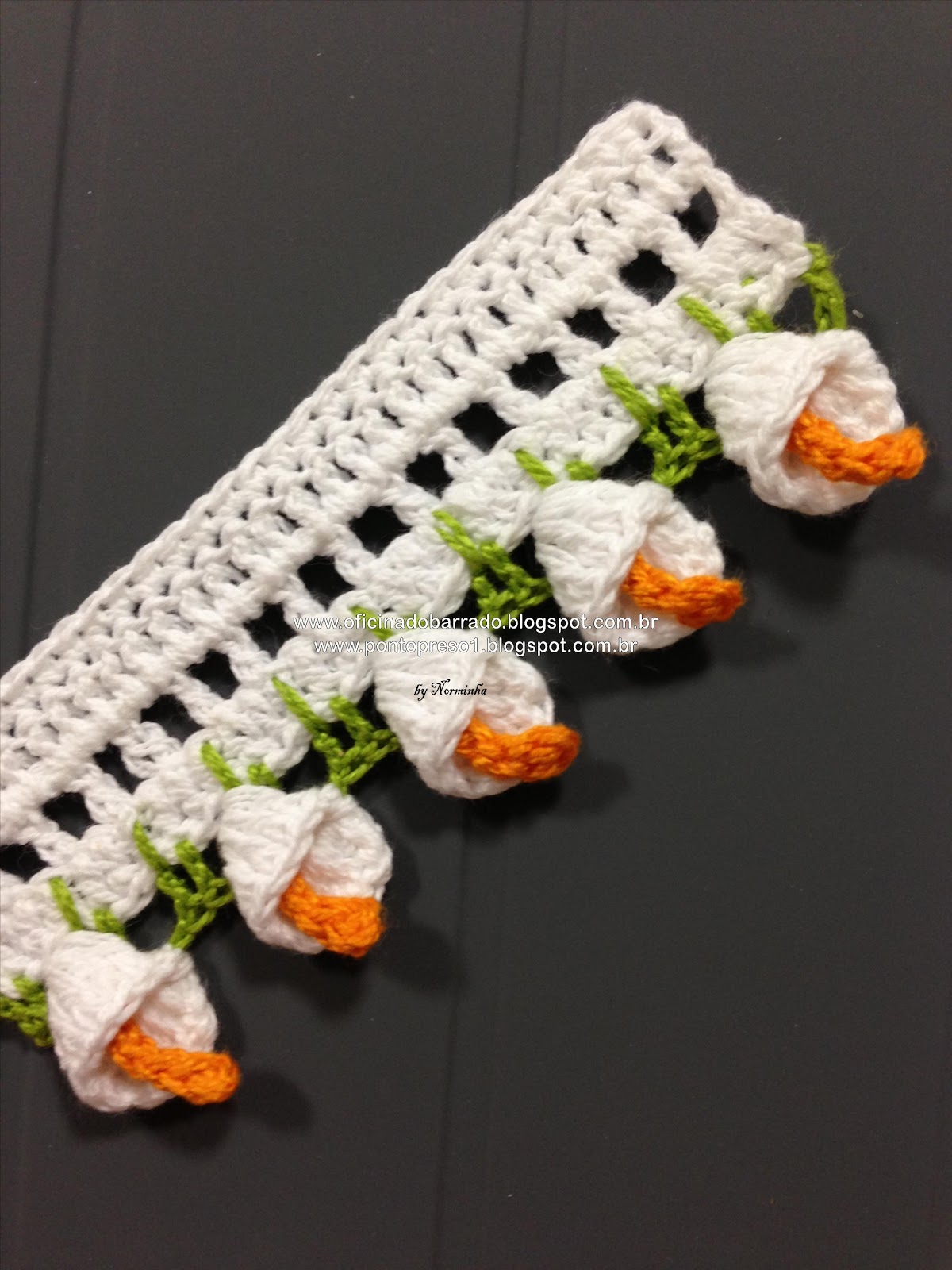 Seguir fazendo as demais pétalas, até o final da barra. Depois, pega a outra extremidade do barrado e faz um passa fitas.