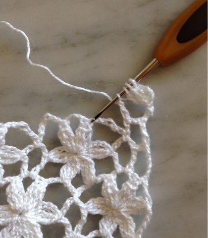 bello. como se haría para tejerlo en en mantel como cenefa o puntilla, es decir como haga para que quede en v durante todo el trayecto del ancho y largo?.mantel de 3 m x 1.80, servilletas de 45 x 45.